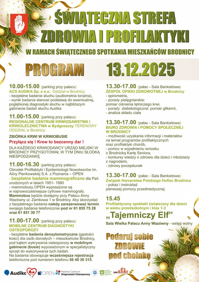 W ramach Świątecznego Spotkania Mieszkańców Brodnicy zapraszamy do specjalnej strefy poświęconej zdrowiu, profilaktyce i badaniom, które będzie można wykonać zupełnie bezpłatnie. To świetna okazja, by zadbać o siebie przed końcem roku — podarujmy sobie zdrowie pod choinkę!